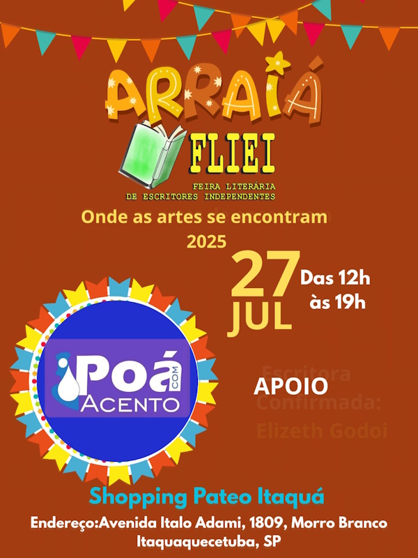 Itaquaquecetuba, SP – Neste domingo, dia 27 de julho, das 12h às 19h, o Shopping Pateo Itaquá será palco de um evento pra lá de especial: o ARRAIÁ FLIEI – Feira Literária de Escritores Independentes, uma verdadeira celebração cultural onde a literatura se encontra com a música, a dança, as comidas típicas, brincadeiras e o melhor do artesanato local.