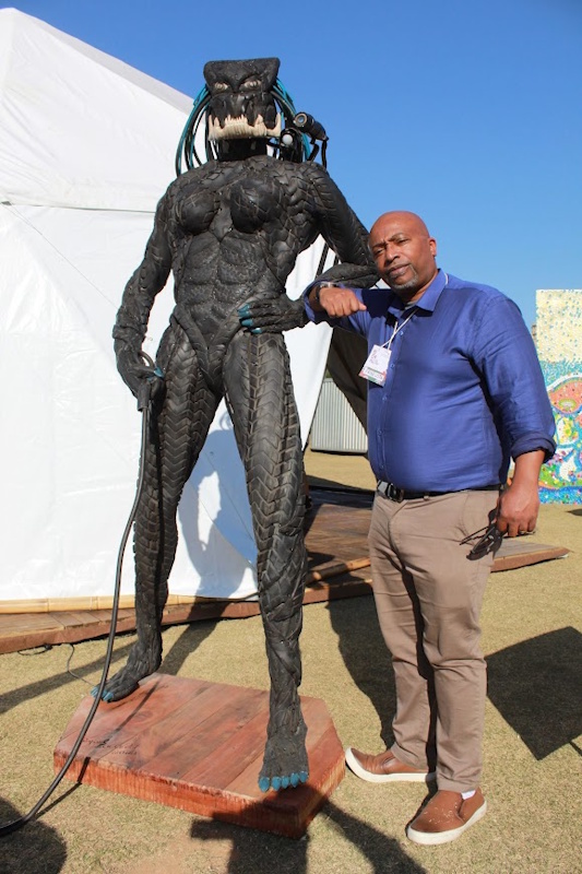 Roberto Rocha marcando presença na Bienal do Lixo em 2022 ao lado de uma obra de arte feita com material reciclado