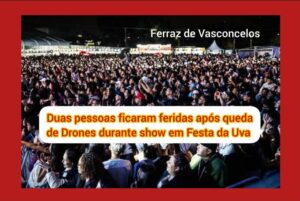 Ferraz de Vasconcelos, SP – Duas pessoas ficaram feridas na noite desta quinta-feira (10) após a queda de um drone durante a 41ª Festa da Uva Fina, em Ferraz de Vasconcelos. Segundo a Secretaria de Comunicação do município, o equipamento sofreu interferência de sinal, o que provocou a perda de controle.
