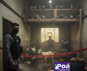 Ao chegar ao endereço, a surpresa: os guardas encontraram grande quantidade de sangue no chão, e, ao adentrar o imóvel, se depararam com um cenário de abate irregular, incluindo restos de animais recentemente abatidos e diversos animais vivos, como pombos, galinhas e bodes.