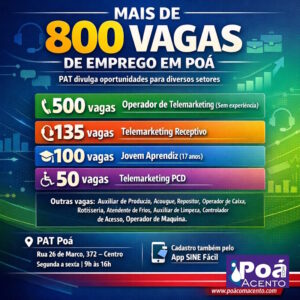 Poá, SP – O Posto de Atendimento ao Trabalhador (PAT) de Poá anunciou uma nova e ampla lista de oportunidades de trabalho para diversos níveis de experiência e escolaridade. O destaque da atualização fica para o setor de serviços e telemarketing, que concentra o maior volume de contratações na cidade e região.